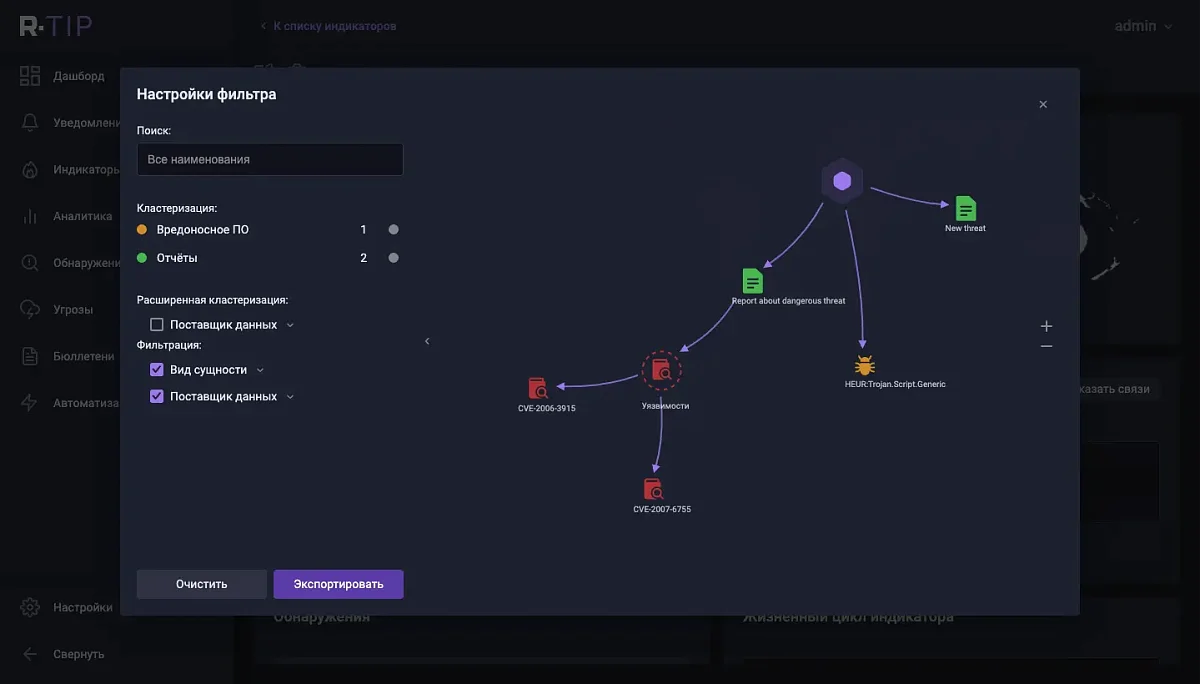 Анализ взаимосвязей помогает ИБ-специалисту правильно интерпретировать данные и сформировать целостную картину угрозы. R‑Vision TIP собирает имеющуюся у поставщика информацию об индикаторе и связанные с ним данные: