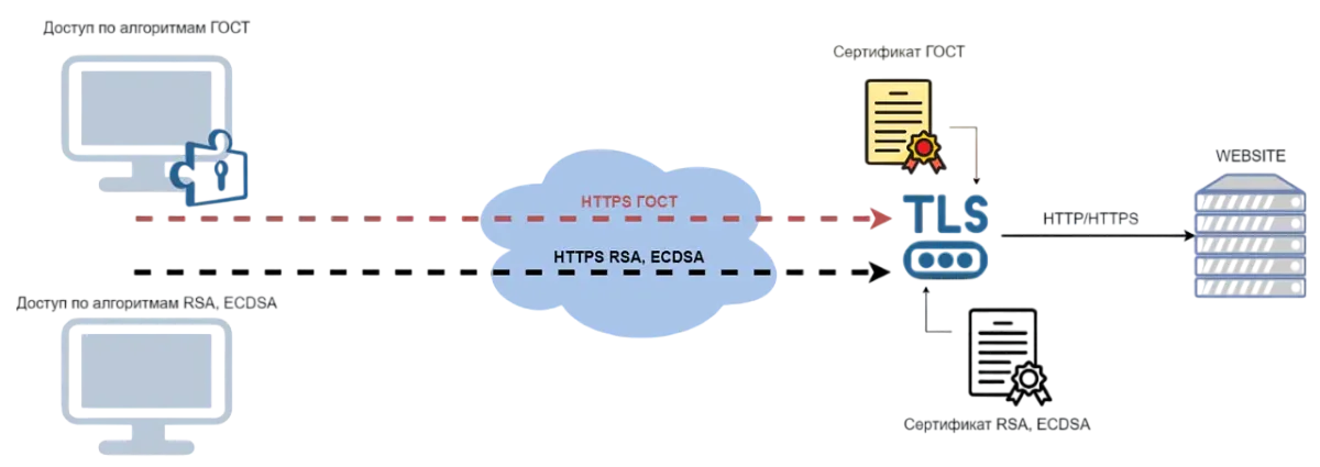 Организация доступа по зарубежным и ГОСТ алгоритмам одновременно. Это решение позволило предоставить доступ к ресурсам как пользователям с криптопровайдерами, поддерживающими ГОСТ, так и пользователям, использующим стандартные браузерные технологии.